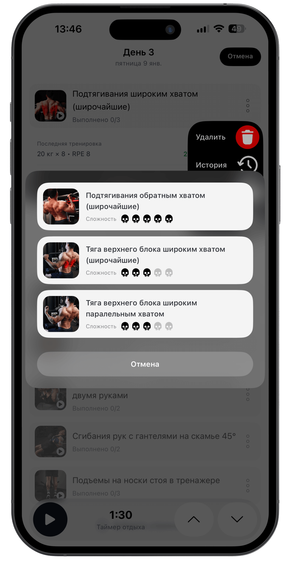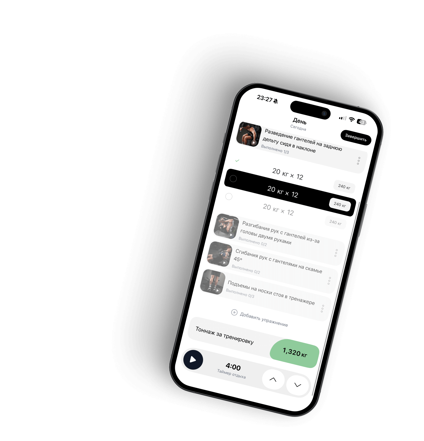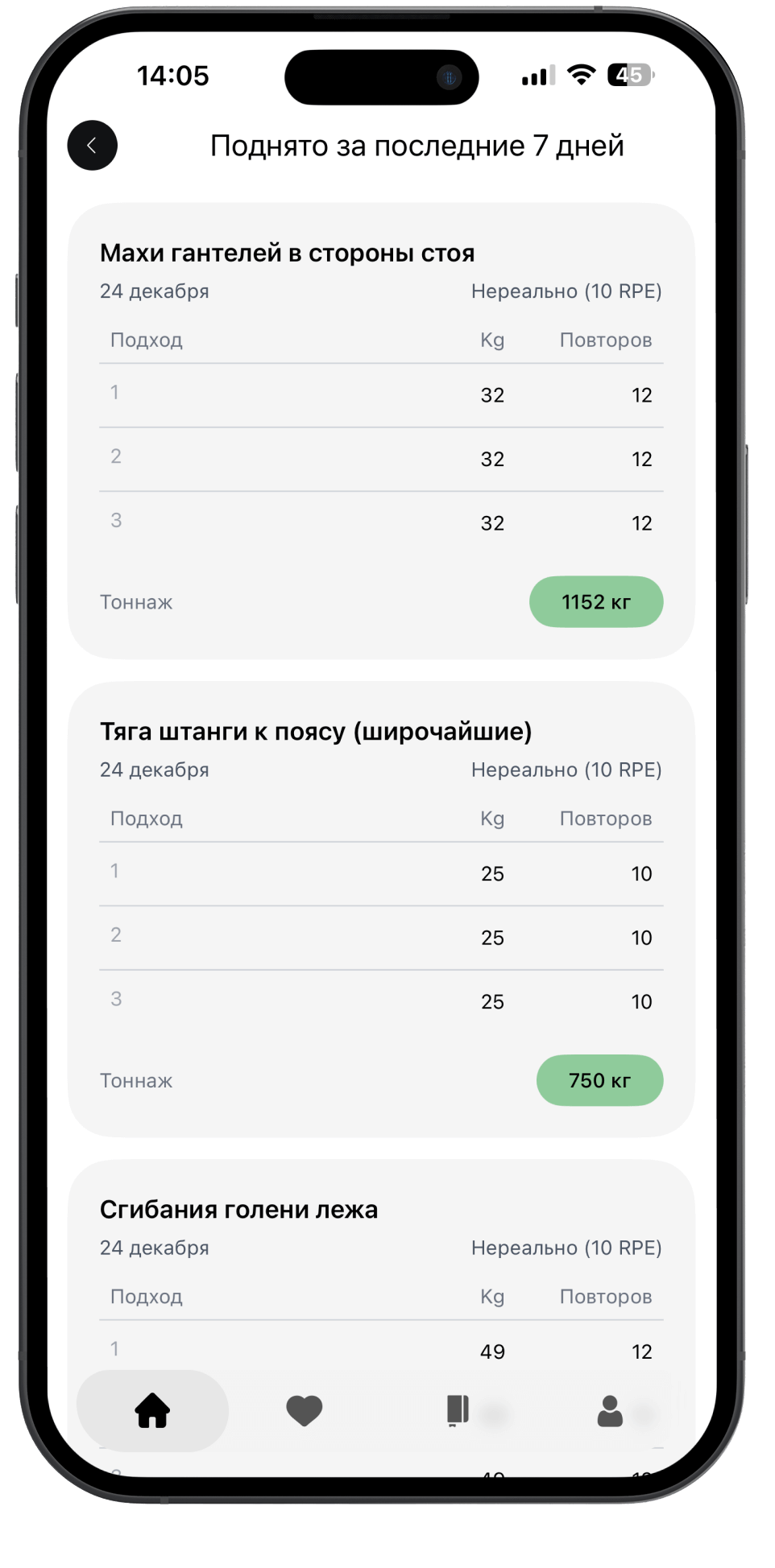 Полная история упражнений - тоннаж, подходы и объём — отслеживайте рост каждую неделю.