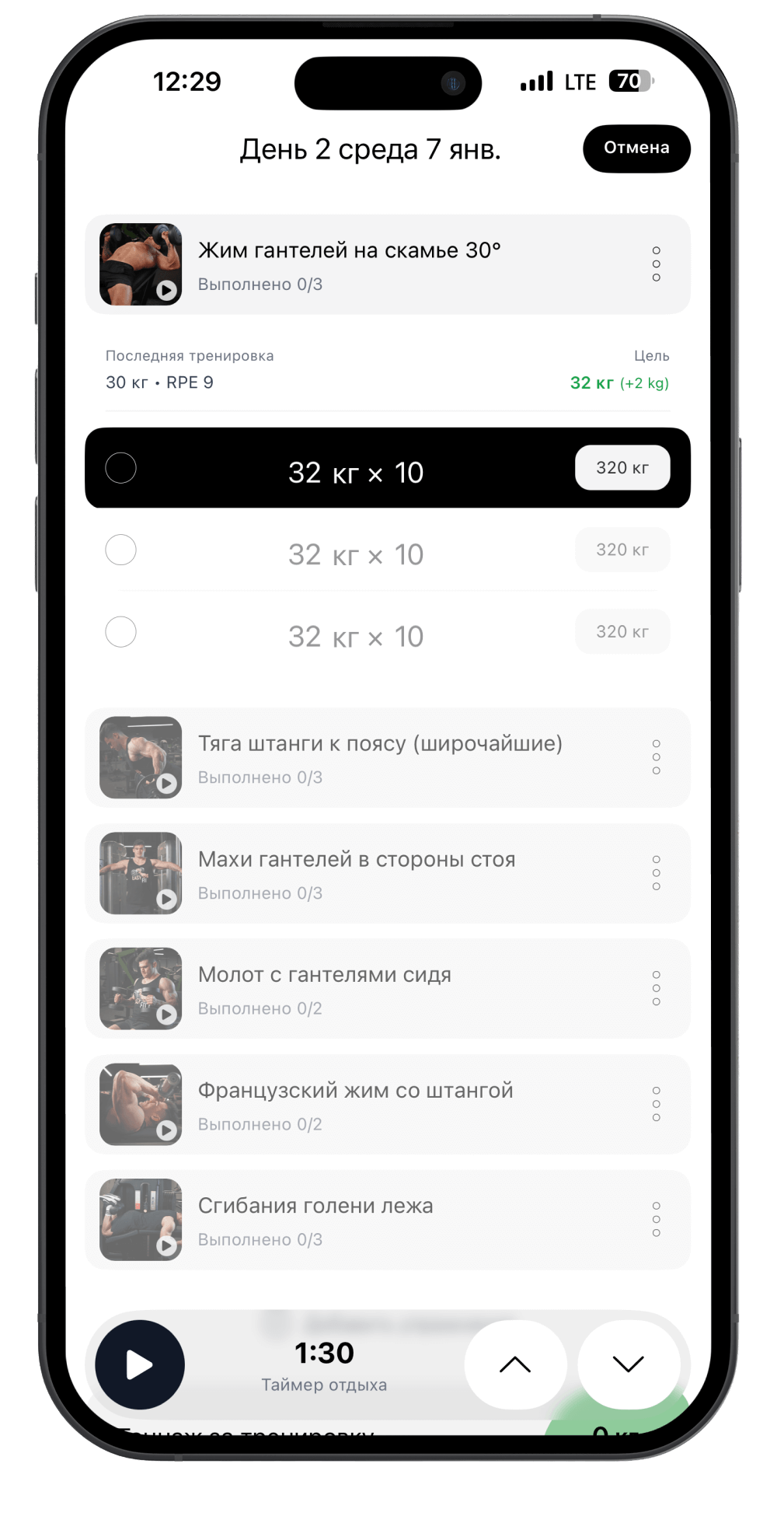 ИИ по 2000+ формулам анализирует ваши сеты и предлагает точный следующий шаг: +2,5 кг, +1 повтор или разгрузку для восстановления